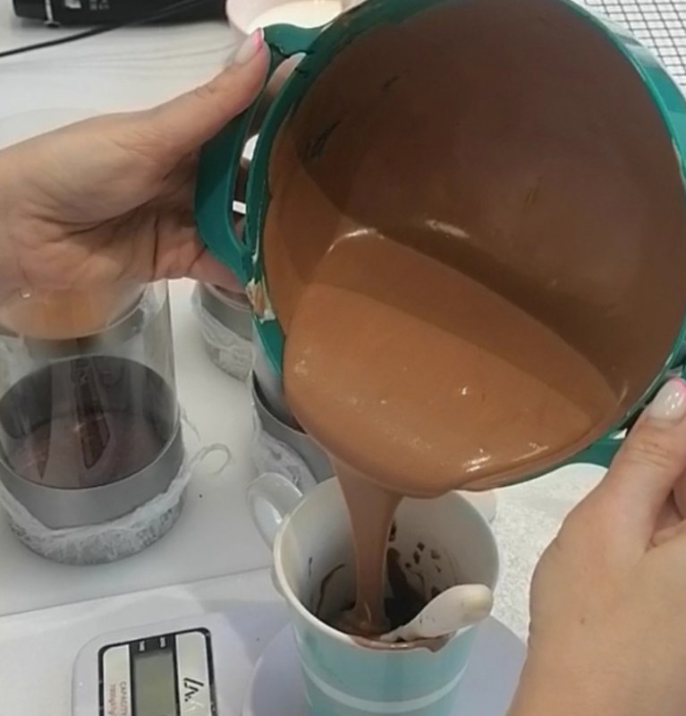 - влейте обратно остывший шоколад к 1/3 , проверьте температуру, она должна быть 31-32°.
