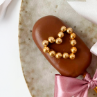 Вокруг центра нежный шоколад, покрытый пищевым блеском праздничного золотистого цвета.