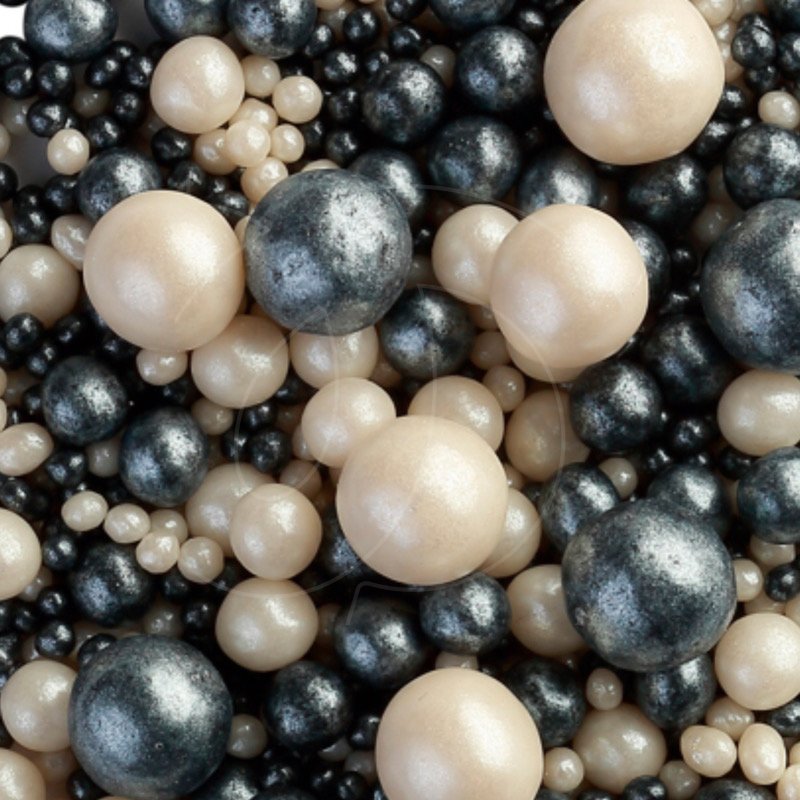 Жемчужная посыпка покрыта ярким пищевым блеском черного и белого цвета.<br>