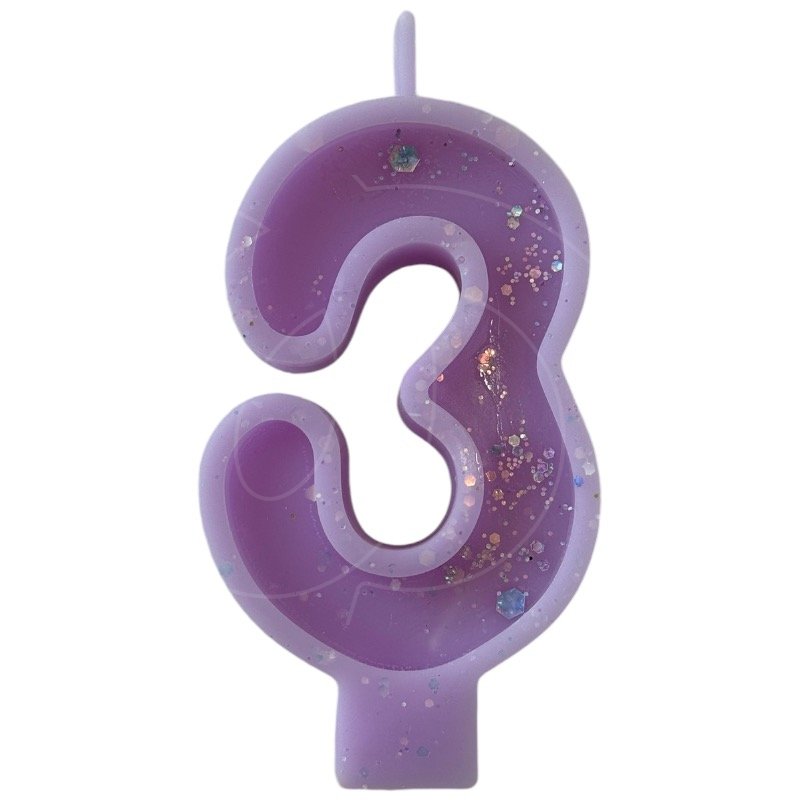 Свеча декоративная Цифра "3" Сиреневая с блёстками