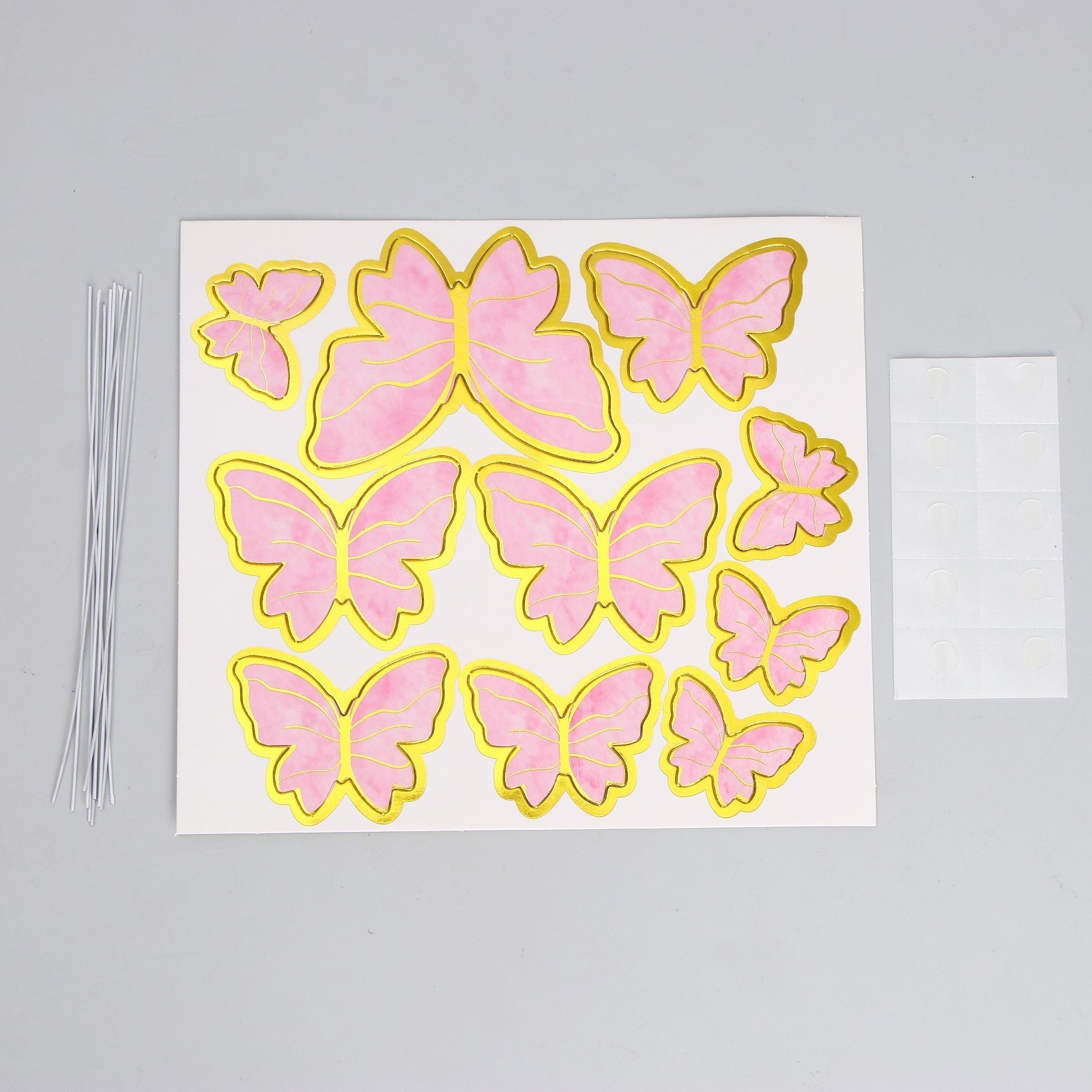 В набор входит 10 бабочек разного размера, 10 проволочек и 10 клеевых точек.