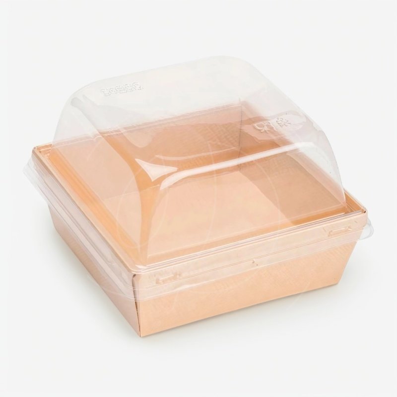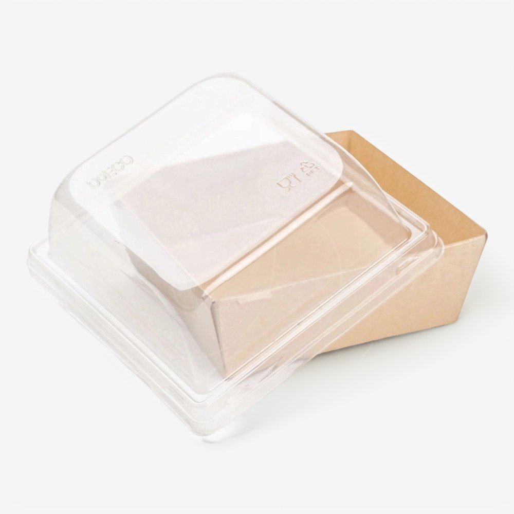 Упаковка выполнена из пищевого картона с жёсткими двойными бортами, дном и пластиковой крышкой.